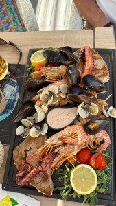 The meal and view, including Mariadz gloriously sitting in the middle of the bay, are perfect. At the end, they offer us a choice of liquors but again Maria can’t choose and we have both. This is the most expensive meal we have had on holiday but it was fantastic.