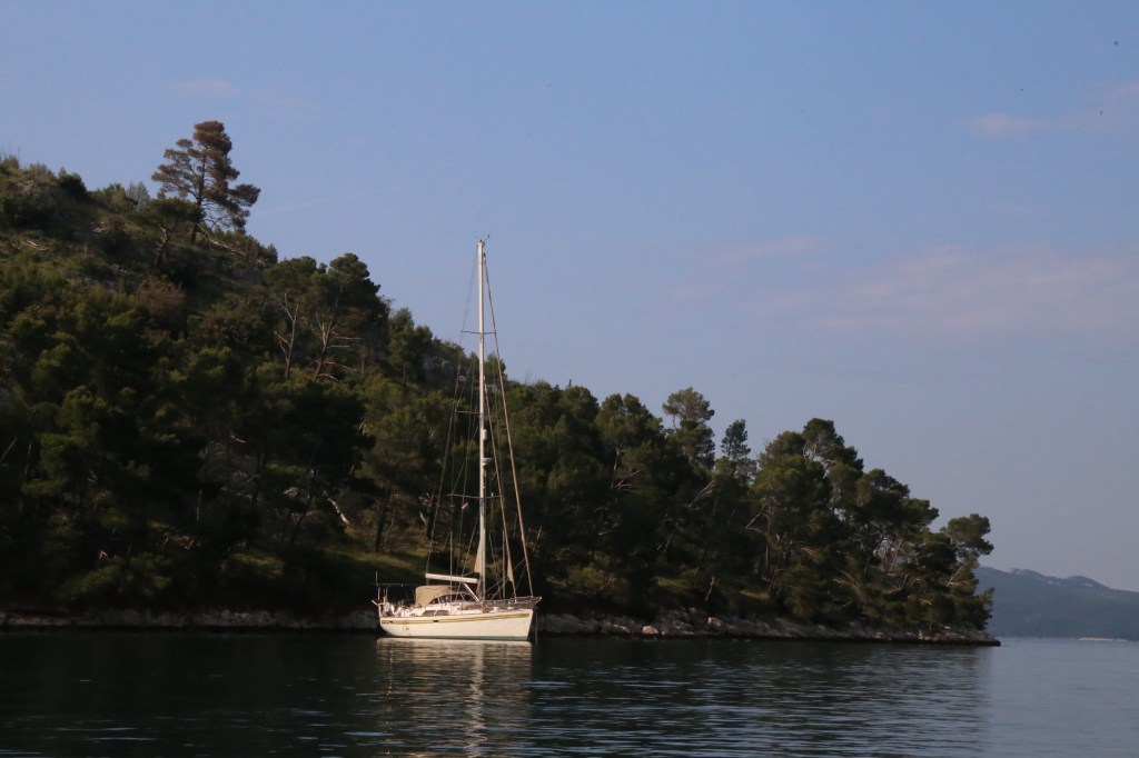 We arrive in Uvala Poplat and there is one other boat in the anchorage. Their position means we need to drop and anchor and attach to a tree but we are confident of this and interestingly after we have finished they do the same on the other side of the bay.