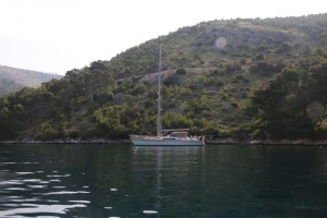 At 6pm, an hour before our table is booked, we make a decision. We are not comfortable here and we will find another bay that is protected. Opposite us is the island of Brac and we can see a really nice looking bay, Uvala Smrka, which has an old disused submarine hideout. It is six miles away and we have two and a half hours of daylight remaining so enough time. It will also require us to get a line ashore again, hopefully we will be quicker than the forty minutes and various mis-steps of the first attempt.