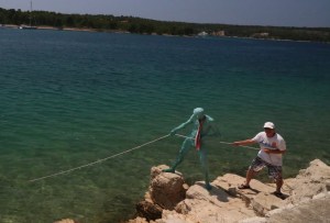 We get off with the boat papers to check into the office and are greeted by a very friendly lady and we have a lovely chat while we check in and pay our fees. We get back to the boat where we now have power so Maria decides she will do some washing while we go off for a swim in the sea and then a shower in the very clean facilities. The coast of Croatia has been quite rocky and so we need swim shoes to get in and as we walk to the beach area, there is a bronze statue of a man fishing using a net from shore. This is just below a picturesque fish restaurant, bargo, which could be somewhere we can try later depending on how the day goes. The beach is rocky, like a lot in Croatia, but the sea is very clear if a little cold for us at 20 degrees.